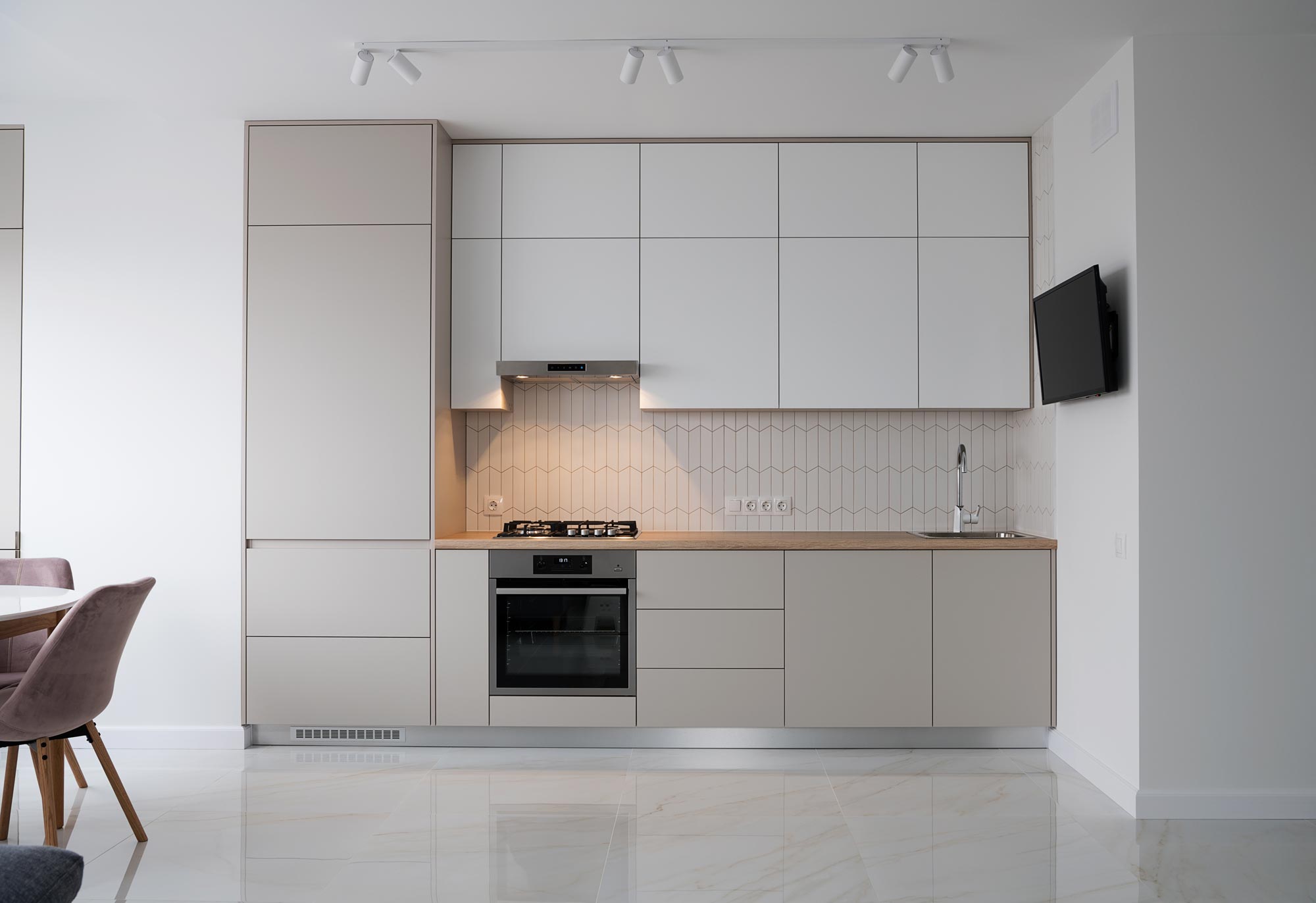 Turėtumėte žinoti kuo bus užpildytas tarpas tarp viršutinų ir apatinių spintelių – plytelėmis, stiklu ar 10mm storio HPL sienelė, kurią galesite pasirinkti tokios pat spalvos kaip stalviršį.